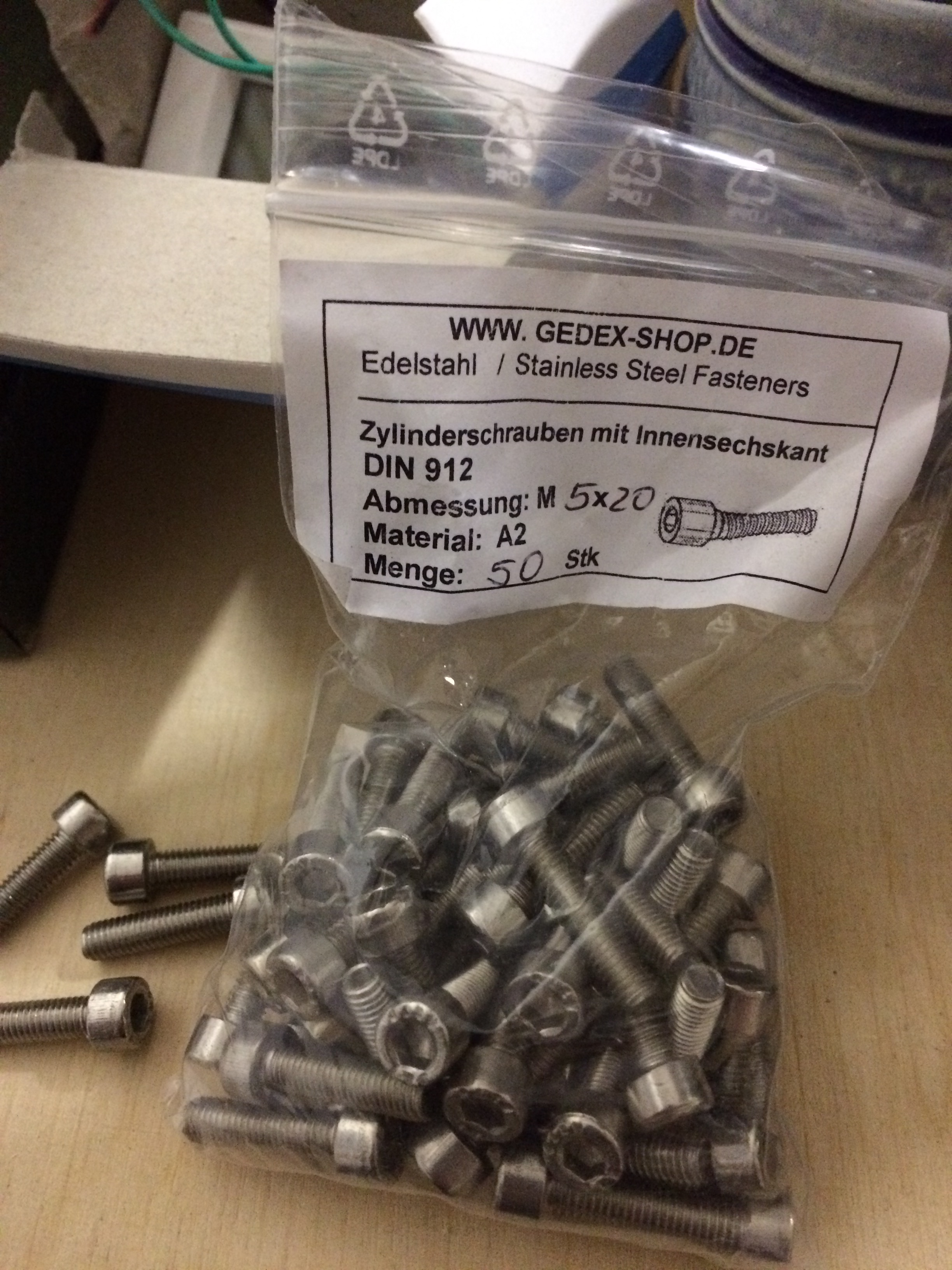 Laut Anleitung werden M4*20 Schrauben benutzt. Ich werde diese jedoch gegen M5 austauschen. Dadurch ergibt sich eine größere Ablagefläche der U-Scheiben.