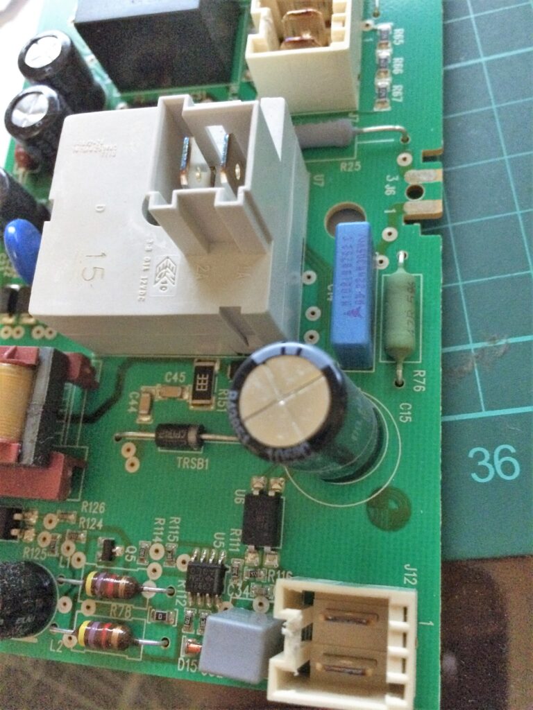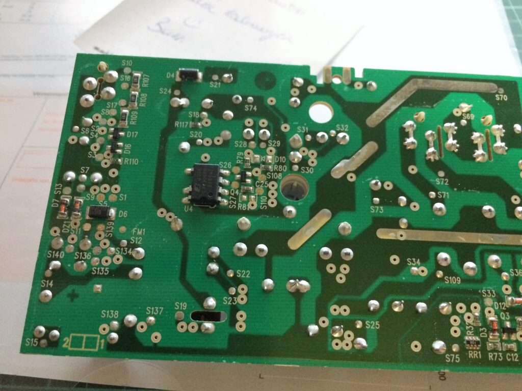Platine ausgebaut, Kondensatoren geprüft, Widerstand gemessen etc. Wie erwartet waren die üblichen Verdächtigen defekt. R76 (47 Ohm 3W) und U4 (LNK304GN)