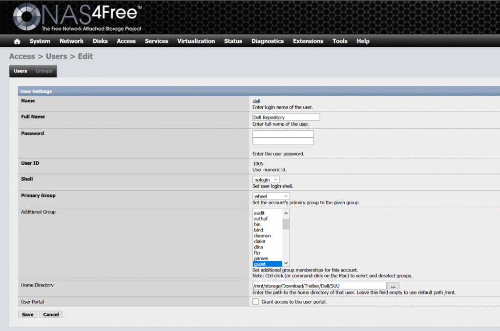 Auf NAS4Free einen User anlegen. Einfachheitshalber wurde es der User dell der auch nur Zugriff auf das Repo Verzeichnis bekam