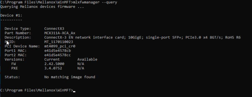 C:\Program Files\Mellanox\WinMFT>mlxfwmanager --query