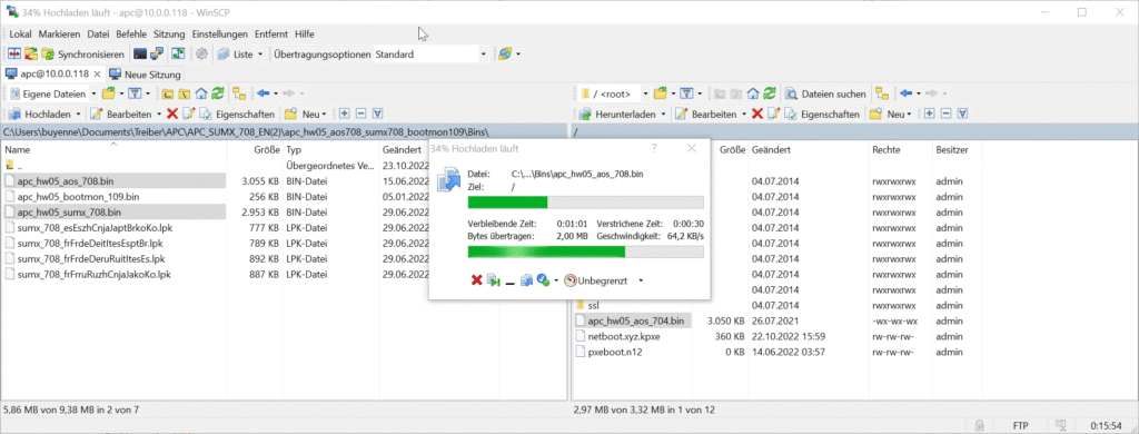 Erste Datei apc_hw05_aos_708.bin wird übertragen. Danach bootet die MNC2 durch. Anschließend kann die zweite Datei apc_hw05_sumx_708.bin (diese fehlte) übertragen werden.