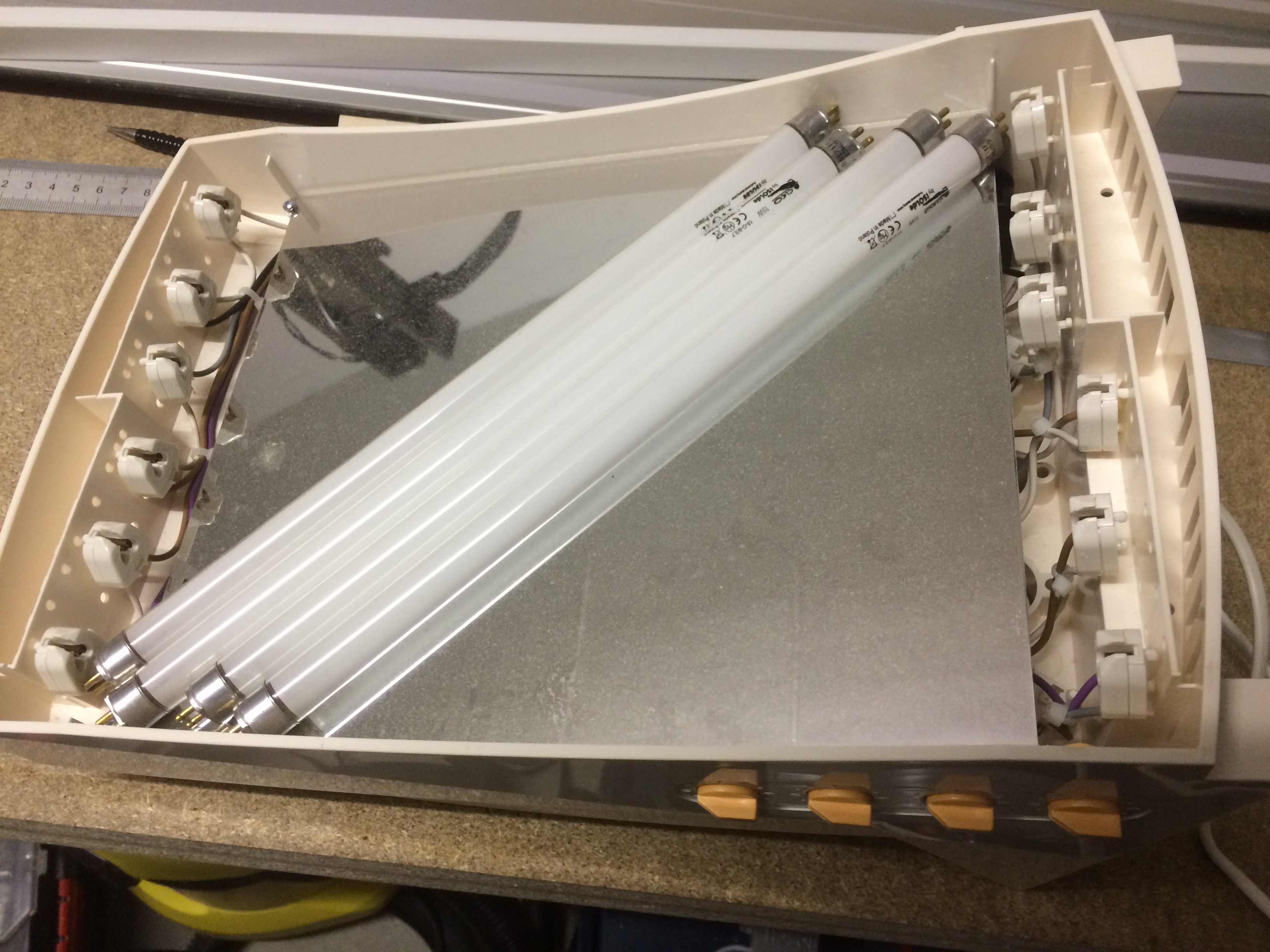 Für die Platinenherstellung kann man entweder die Direkttoner Methode anwenden oder die Photosensitiven Platinen UV belichten. Besagte Geräte sind nicht gerade preiswert. Habe mir daher einen gebrauchten Gesichtsbräuner in der Bucht geschossen. Ca € 10,- inkl. Porto. Den Alu Koffer hatte ich noch übrig. Genug Holzreste sind noch vorhanden für eine “Trägerplatte”. Die Kunststoffwinkel kosten nochmal € 3,-.